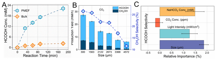 界面电场对水合电子反应性的调控:研究发现,当体系从体相溶液转变为半径小于10 μm的微液滴时,气液界面形成的10⁹ V·m⁻¹强电场从根本上改变了水合电子的反应行为。以CO₂还原为探针,发现界面水合电子倾向于进行多电子转移过程,产物从体相中的甲酸(两电子产物)转变为甲醇(六电子产物,选择性高达99%)。这一发现首次证明了界面电场可作为水合电子反应路径的分子开关。