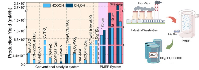 图4 PMEF系统与既往体相溶液中HCOOH和CH3OH产率的对比; 利用PMEF系统将工业废气CO2与SO2转化为碳氢燃料的系统构想