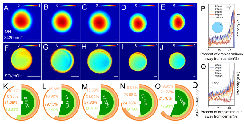 图2 (A-E) 不同尺寸微液滴(直径22、36、60、90、160 μm)中水分子的二维SRS强度图(OH振动模式)比例尺 = 10 μm; (F-J) Na2SO3的归一化浓度分布; (K-O) 五个同心区域内Na2SO3含量分布的量化饼图; (P) 不同尺寸微液滴中Na2SO3和(Q) NaHCO3的径向离子浓度分布
