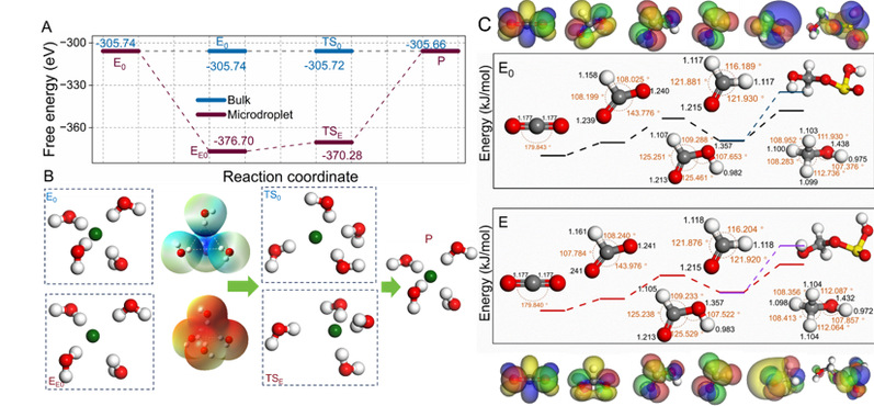 图3 (A) 水合电子(eaq⁻)解离的自由能变化 (B) 量子化学计算得到的优化几何构型与反应 (C) CO2还原反应路径的能量变化和HUMO、LUMO轨道