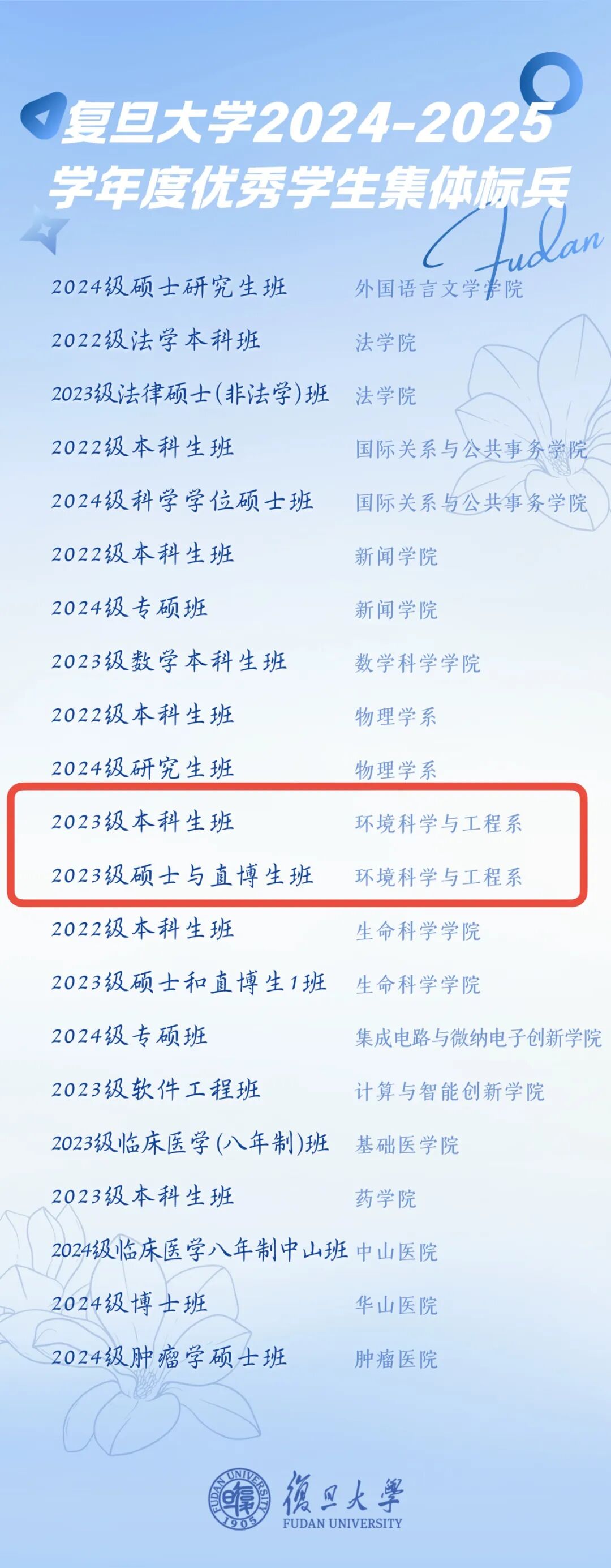 日前,2024—2025学年度复旦大学标兵评审结果揭晓。环境系2023级本科生班、2023级硕士与直博生班获评2024-2025学年度复旦大学优秀学生集体标兵。一起来看看这两个班级的风采吧!✨✨