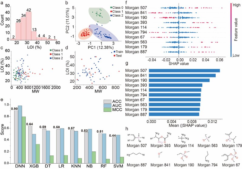 阻燃预测模型的开发: 在数据整理与分析阶段,利用 K-means 聚类和 PCA 处理数据,将 LOI数据集分 3 类,以LOI区间最大的数据集训练模型,其余数据作验证集。模型构建与评估时,基于 LOI 中位数构建平衡数据集,运用机器学习构建模型,结果显示 DNN 模型表现最佳,XGB 模型次之,其他低准确率模型被排除。模型解读方面,通过 SHAP 方法发现,DNN 和 XGB 模型都表明摩根507(P=N连接苯环)和114(季碳)对增强阻燃性意义重大,DNN 模型还因调整子结构权重提升了预测准确率。