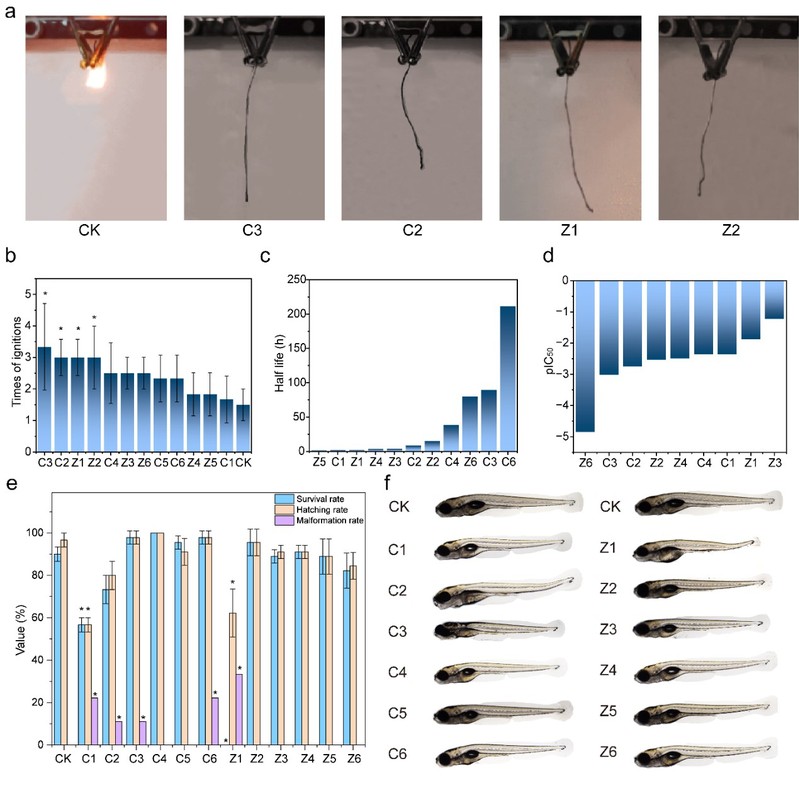 筛选的候选OPFR的实验验证: 研究团队对筛选出的6种新的有机磷阻燃剂(OPFRs)和6种已商用阻燃剂进行实验验证。在阻燃性测试方面,针对12种化合物,开发了通过计数聚酯线燃烧次数的阻燃测试新方法,结果显示新阻燃剂Z1和Z2在阻燃测试中表现突出,具有优良的阻燃效果。在降解性测试中,考察化合物在紫外线和臭氧条件下的降解半衰期,发现Z1和Z2的降解半衰期分别为2.5小时和15小时,而商用阻燃剂C3虽阻燃性好,但降解半衰期达89小时,易造成环境污染。细胞毒性测试表明,Z2的IC50为335.4 μM,毒性相对较低,同时。斑马鱼胚胎毒性实验显示,Z2在各项测试中表现良好,具有有成为新型商业OPFR的潜力。