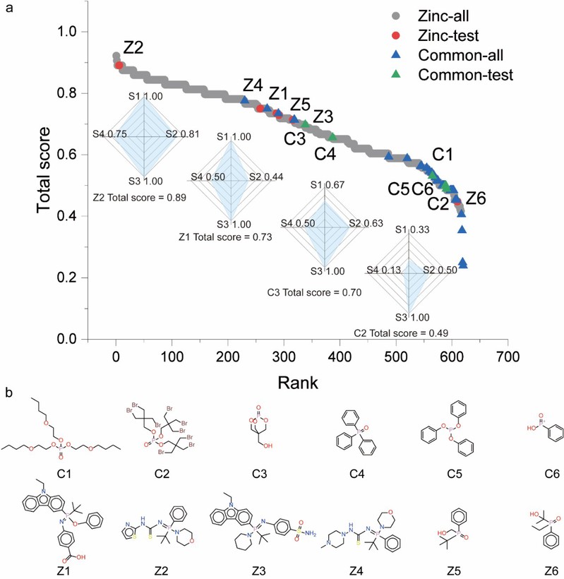 总结:过去,在阻燃剂领域,人们的关注重点主要集中在传统卤化阻燃剂的危害以及有机磷阻燃剂(OPFRs)作为替代品的潜力上,却忽视了对OPFRs深入研究的紧迫性。由于OPFRs化学结构多样,其不同结构所表现出的阻燃性能、毒性、降解性等差异极大。本研究首次提出了一种可解释的人工智能辅助产品设计(AIPD)方法框架,能够高效筛选新型、安全且有效的OPFRs,并深入探究其多种特性。从 ZINC 数据库筛选出候选化合物,通过综合评分系统考量吸收、毒性和持久性等因素进行排序。经实验验证,化合物 Z2 表现出高阻燃性、易降解和低毒性的特点,有成为新型商业 OPFR 的潜力。